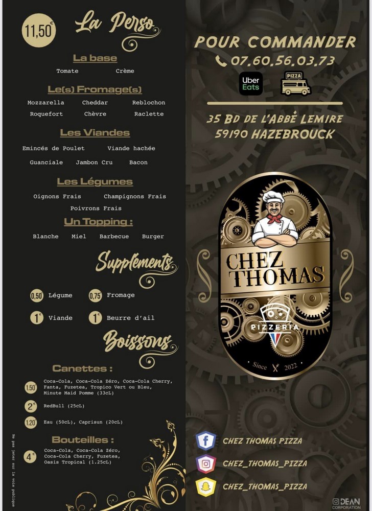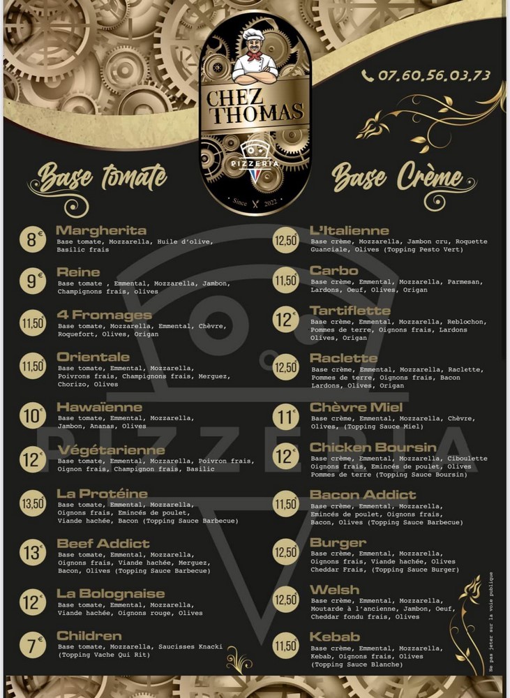 Chez Thomas, pizzeria à Hazebrouck, vous présente la carte de ses pizzas.