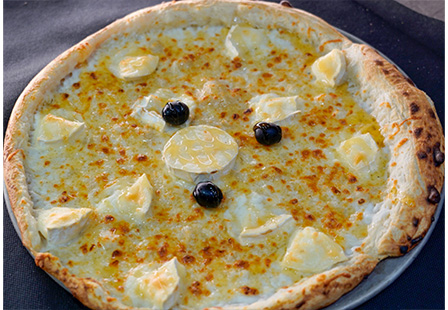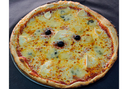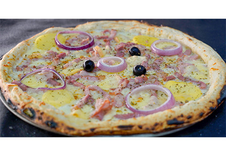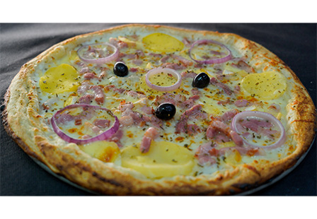 Base crème, Emmental, Mozzarella, Reblochon, Pommes de terre, Oignons frais, Lardons, Olives, Origan