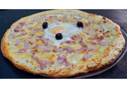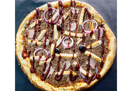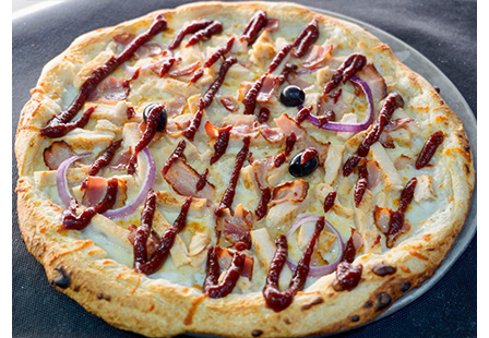 Base tomate, Emmental, Mozzarella, Oignons frais, Emincés de poulet, Olives, Viande hachée, Bacon (Topping Sauce Barbecue)