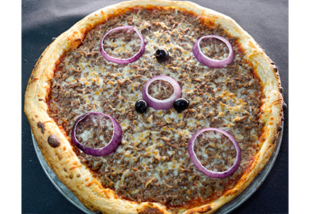 Base tomate, Emmental, Mozzarella, Oignons frais, Viande hachée, Merguez, Bacon, Olives (Topping Sauce Barbecue)