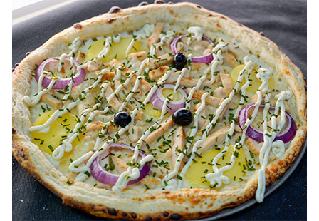 Base crème, Emmental, Mozzarella, Ciboulette, Oignons frais, Emincés de poulet, omme de terre, Olives (Topping Sauce Boursin)