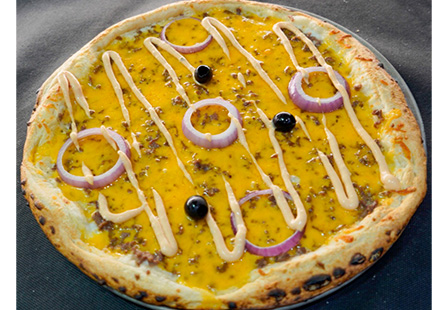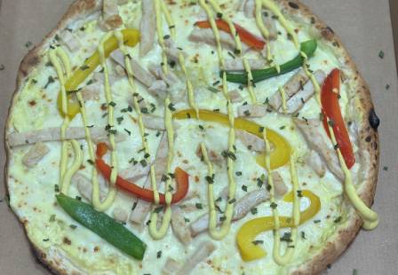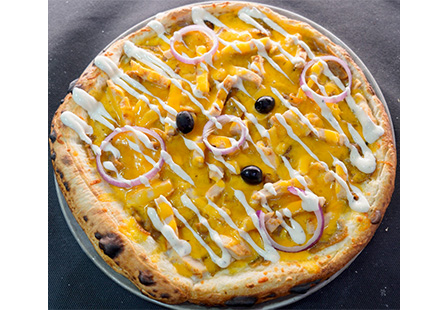 Base crème curry, mozzarella, émincés de poulet, poivrons, ciboulette, topping sauce curry.