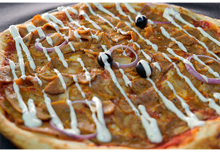 Base tomate, Emmental, Mozzarella, Kebab, Oignons frais, Olives (Topping Sauce Blanche)