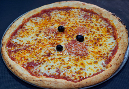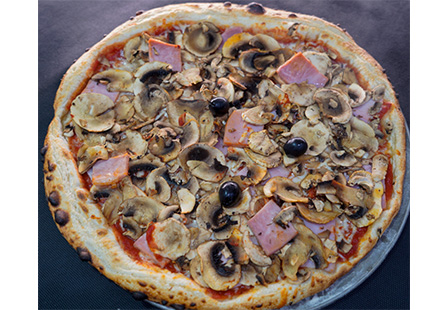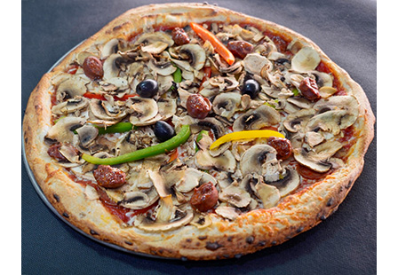 Base tomate, Emmental, Mozzarella, Poivrons frais, Champignons frais, Merguez, Chorizo, Olives