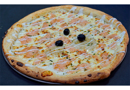 Base crème, Mozzarella, Saumon fumé cuit, Estragon, Olives (Topping Sauce Citron)